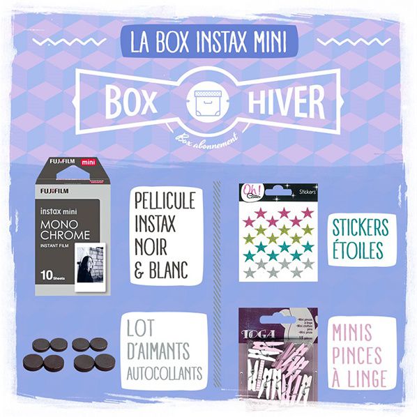 - la box hiver instax mini : une pellicule instax noir et blanc (10 photos), des stickers étoiles, un lot d’aimants autocollants, et des minis pinces à linge